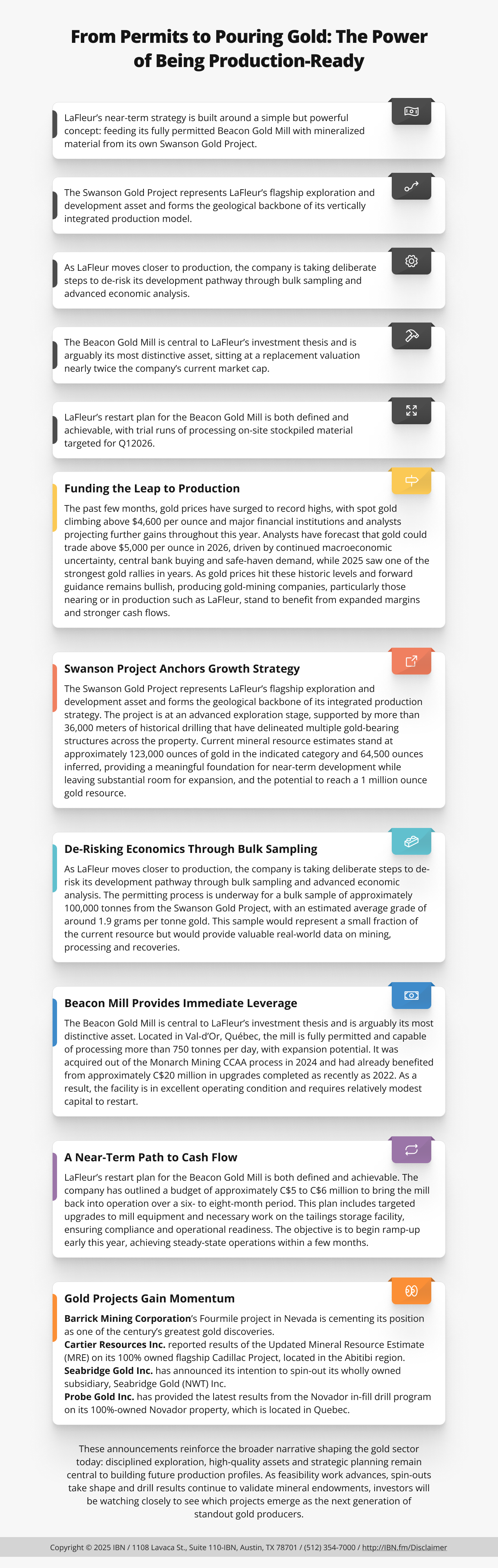 MiningNewsWire Editorial Coverage: The most powerful moment to get involved in a mining company’s story is often not at the earliest discovery stage, or even after production is fully established, but at the precise inflection point when a company transitions from explorer to producer. This is the stage where geological risk has been substantially reduced, infrastructure decisions have been made and capital is finally aligned with execution, creating the conditions for outsized valuation re-ratings. Solid funding is essential at this juncture, as it allows management teams to shift from conceptual planning to tangible value creation. This scenario is now taking shape at LaFleur Minerals Inc. (CSE: LFLR) (OTCQB: LFLRF) (FSE: 3WK0) (Profile), a Québec-based gold company that recently completed an oversubscribed and upsized $7.8 million financing and is now funded to restart production at its Beacon Gold Mill, positioning the company at exactly the point where upside potential historically accelerates. LaFleur stands out in a crowded junior mining landscape because it controls a rare combination of advanced exploration assets and fully permitted, refurbished production infrastructure in one of the world’s most prolific gold regions. The company owns the Beacon Gold Mill outright, a modern facility in excellent condition that has already undergone substantial upgrades, while also advancing its wholly owned Swanson Gold Project as a near-term source of mineralized material. Despite being years ahead of many regional peers that are still navigating permitting and infrastructure hurdles, LaFleur continues to trade at a discount to the underlying value of its assets, creating what appears to be a compelling disconnect between market valuation and operational readiness. LaFleur is at a strategic inflection point as it transitions to near-term revenue generation in Canada’s largest gold-producing region, sits among a strong group of gold-focused mining companies dedicated to being leaders, including Barrick Mining Corporation (NYSE: B) (TSX: ABX), Cartier Resources Inc. (TSX.V: ECR), Seabridge Gold Inc. (TSX: SEA) (NYSE: SA) and Probe Gold Inc. (TSX: PRB) (OTCQB: PROBF).