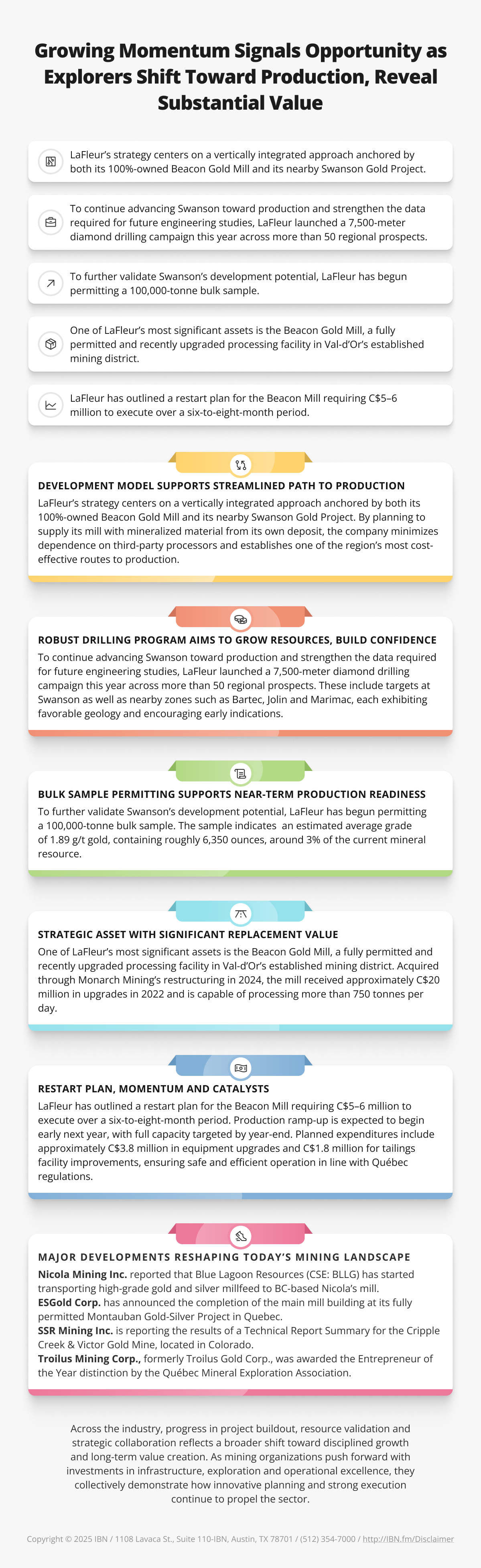 MiningNewsWire Editorial Coverage: The period when a mining company advances from pure exploration into the early stages of production is often one of the most advantageous entry points for investors. This transition, when a company moves from discovery to the potential for meaningful cash flow, frequently marks a powerful value rerating. Companies that successfully navigate this development stage typically reduce operational risk, demonstrate tangible production capability and lay the groundwork for recurring revenue. For many investors, participating at this inflection point provides exposure before the full upside associated with initial production growth is recognized. The opportunity has the potential to be even more compelling when a company operates in a world-class jurisdiction, controls its own infrastructure and trades below the estimated replacement value of its assets. This is the case for LaFleur Minerals Inc. (CSE: LFLR) (OTCQB: LFLRF) (FSE: 3WK0) (profile), which owns a fully permitted and modernized gold mill in Québec’s Abitibi region and is positioned further along the development curve than many peers. With broad land holdings, an advancing flagship deposit and a clear path toward production, LaFleur is well exposed to the explorer-to-producer transition that has historically delivered some of the strongest returns in the mining sector. The company is working alongside other companies focused on establishing leadership roles in the mining industry including Nicola Mining (TSX.V: NIM) (OTCQB: HUSIF), ESGold Corp. (CSE: ESAU) (OTC: ESAUF), SSR Mining Inc. (NASDAQ: SSRM) and Troilus Mining Corp. (TSX: TLG) (OTC: CHXMF).