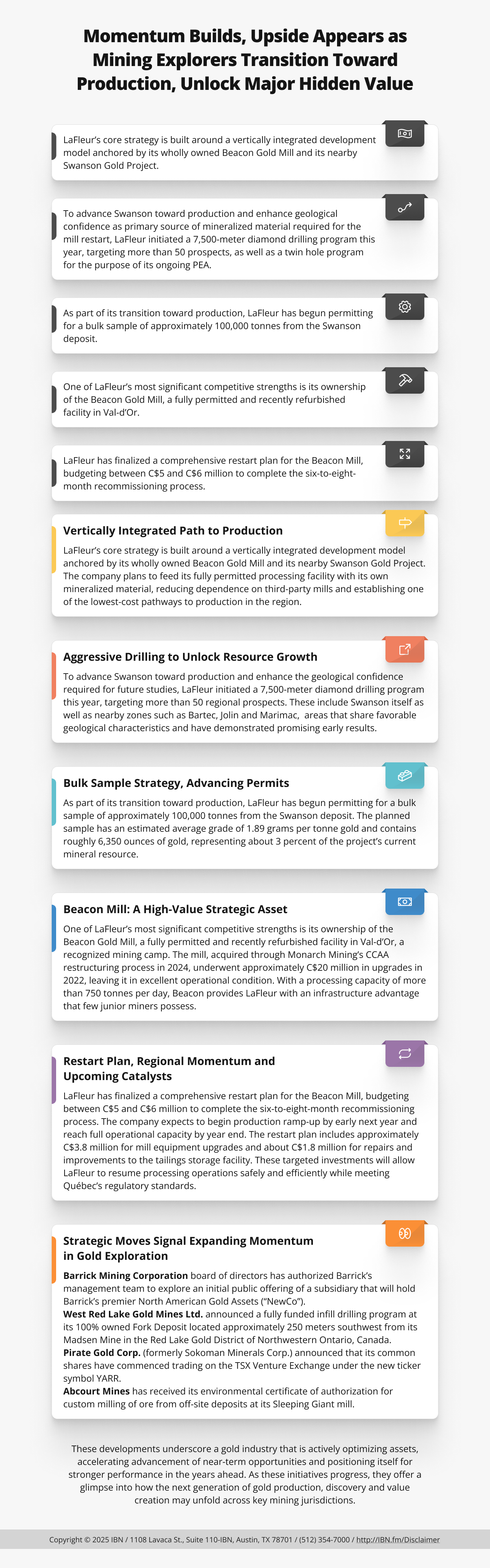 MiningNewsWire Editorial Coverage: The most compelling moment for investors to engage with a mining company is often during its transition from explorer to producer, a period when value can inflect sharply as an organization shifts from discovery to cash flow. Explorers that successfully cross this development threshold tend to realize significant re-ratings because they de-risk their story, demonstrate reliable production capability and create a foundation for recurring revenues. For many interested in the mining space, entering at this stage allows participation before the substantial upside typically associated with the first years of production is fully priced in. This moment becomes particularly attractive when a company controls key infrastructure, is advancing toward production in a tier-one jurisdiction and trades at a valuation meaningfully below the replacement cost of its assets. That dynamic is now unfolding around LaFleur Minerals Inc. (CSE: LFLR) (OTCQB: LFLRF) (FSE: 3WK0) (profile), which owns a fully permitted and refurbished gold mill in Québec’s Abitibi region and is positioned well ahead of neighboring peers still working through early development stages. With a district-scale land position, an advancing flagship deposit and near-term production plans, LaFleur offers meaningful leverage to the explorer-to-producer inflection point, which historically delivers some of the best returns in the mining sector. LaFleur is among a strong group of companies working to become leaders in the mining space, including Barrick Mining Corporation (NYSE: B) (TSX: ABX), West Red Lake Gold Mines Ltd. (TSX.V: WRLG) (OTCQB: WRLGF), Pirate Gold Corp. (TSX.V: YARR) (OTCQB: SICNF) and Abcourt Mines (TSX.V: ABI) (OTC: ABMBF).