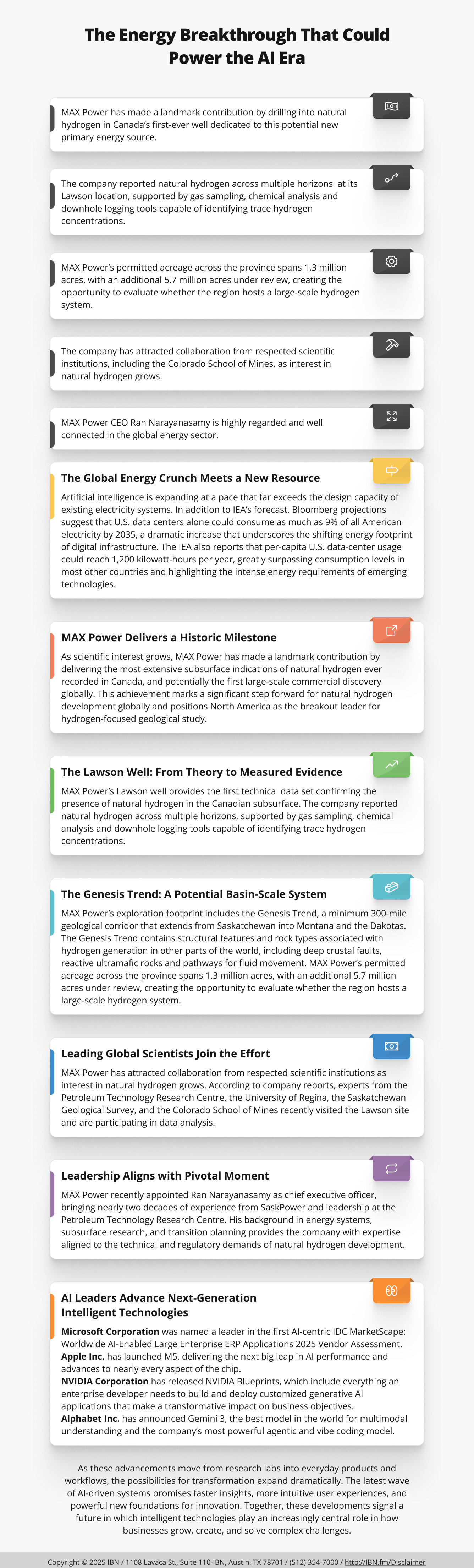MiningNewsWire Editorial Coverage: Global electricity demand is entering a historic inflection point. The International Energy Agency (“IEA”) now forecasts that worldwide data center electricity consumption will nearly double by 2030, with AI-driven centers multiplying their energy use more than four-fold over the same period, a pace that strains already overloaded grids across the United States, China, Europe, Southeast Asia and elsewhere. The constraint is no longer bandwidth or chip capability — it is electricity itself. Amid this tightening energy landscape, a compelling new frontier is emerging: natural hydrogen, a geologic form of hydrogen being generated continuously within the Earth’s subsurface. Unlike manufactured hydrogen, geologic hydrogen can be produced without electrolysis and emits only water when used for energy production. It may represent the first scalable, low-carbon baseload power source for AI-era demand. That is why MAX Power Mining Corp. (OTC: MAXXF) (CSE: MAXX) (profile) has become the first publicly traded company in North America to advance a massive land package (1.3 million acres) permitted specifically for natural hydrogen exploration and development, including a commercial-scale natural hydrogen well, positioning itself at the forefront of a new energy class. MAX Power is working to establish itself as a leader among well-known companies that are innovating and leading in the AI space, including Microsoft Corporation (NASDAQ: MSFT), Apple Inc. (NASDAQ: AAPL), NVIDIA Corporation (NASDAQ: NVDA) and Alphabet Inc. (NASDAQ: GOOG).